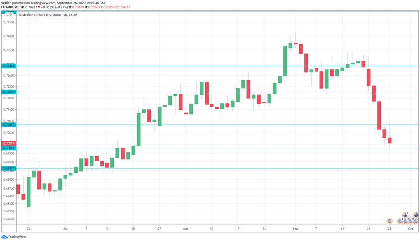 0.7087 has switched to a resistance role after sharp losses by AUD/USD last week.