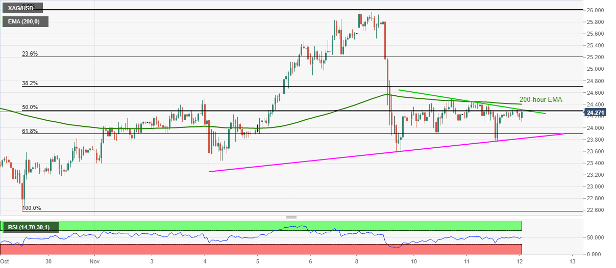Silver prices take a U-turn from intraday low while rising to $24.25 during early Thursday. In doing so, the metal buyers attack a falling trend line from Tuesday and 50% Fibonacci retracement of October 29 to November 08 upside.