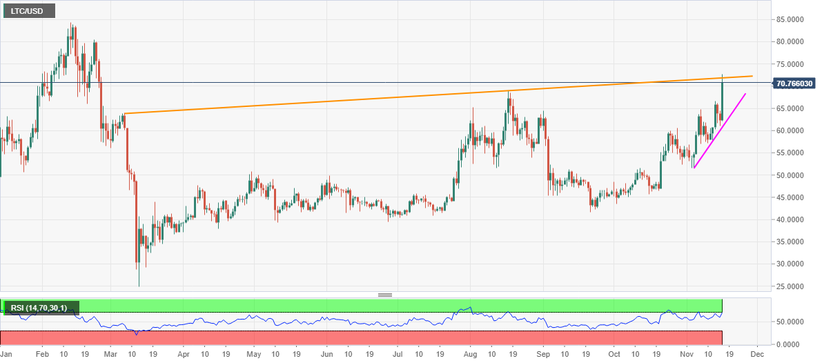 - LTC/USD eases from the highest since late-February, keeps the 70.00 threshold.