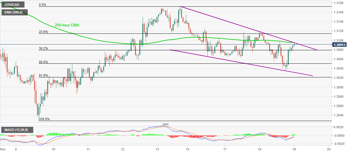 USD/CAD rises to 1.3095 during the early Thursday’s trading in Asia. In doing so, the pair confronts a joint of 200-hour EMA and a falling trend line from November 13, forming part of a short-term falling wedge.