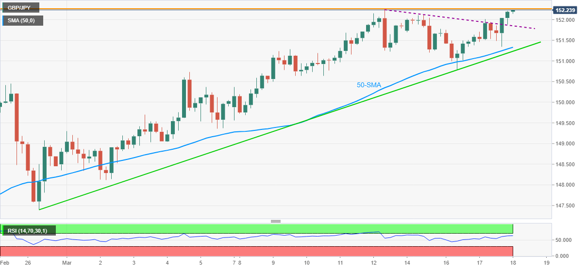 GBP/JPY takes the bids near the weekly top, currently up 0.17% around 152.23, during the initial Asian session trading on Thursday. In doing so, the quote extends the previous day’s upside break of short-term resistance line, now support, towards the multi-month high flashed during the last week.