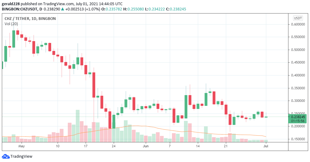 CHZ has seen its price take a battering of late like most other cryptos. It is own around 60% from its all time high of $0.69 in early May and is currently trading at the $0.24 level. However with more and more sports clubs embracing the concept