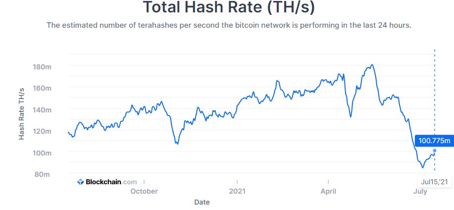 The drop in Bitcoin price and the crackdown in China saw the hashrate nosedive from April’sApril’s peak of $179.32 TH/s to a yearly low of 86.2 TH/s. Meanwhile, the mining power is on the rise and holds at 100.77 TH/S.
