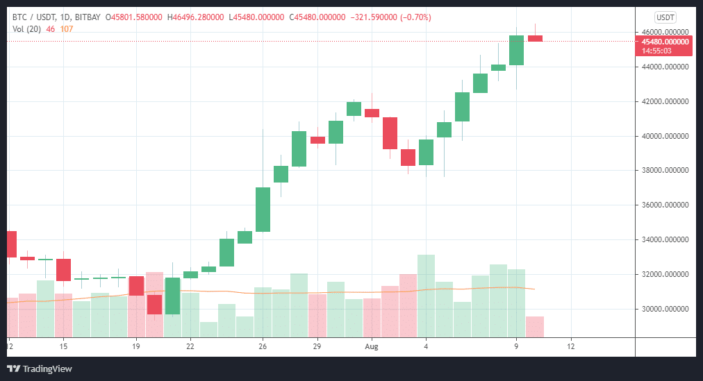 The Bitcoin price has been on a rise since 4th August when it was trading at the $38500 mark. Yesterday’s close of $46500 represents an almost 20% gain over just 5 days which is quite impressive. However, Bitcoin has now seemingly hit a strong resistance level at the $46K to $47K mark.
