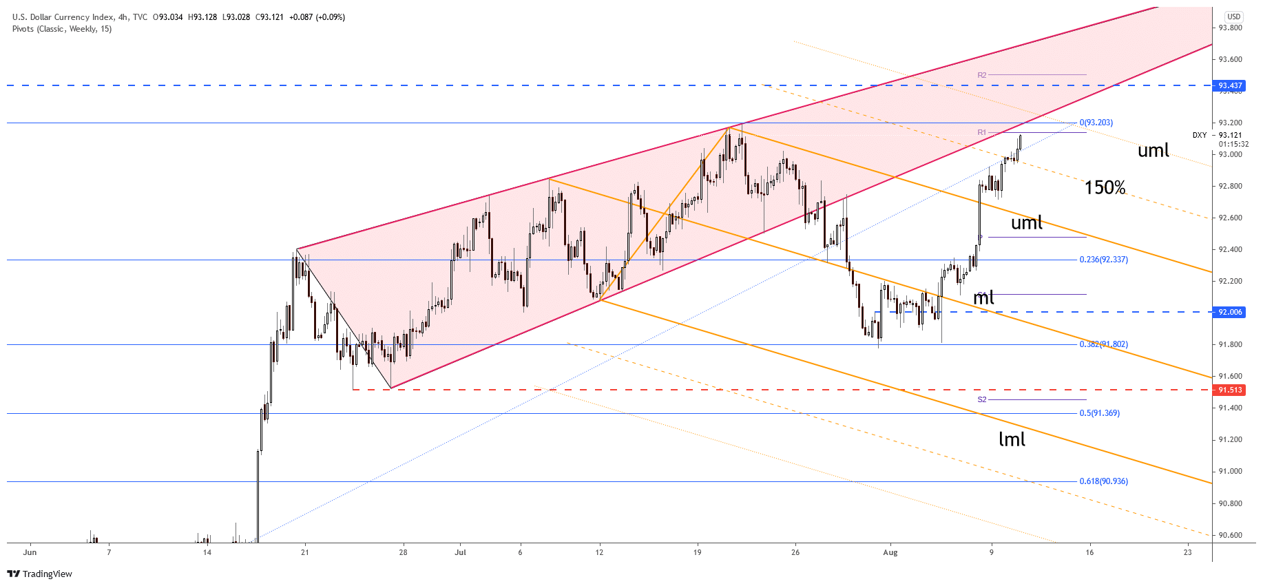 DXY price has increased as much as 93.13, and it was almost to reach the 93.14 weekly R1. A bearish pattern printed here could signal a potential downside movement. The 93.19 higher high is seen as static resistance. Also, the uptrend line represents a dynamic resistance.