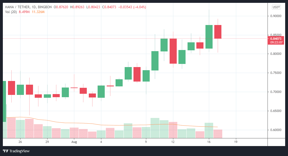 The MANA Price is in slight retreat over the past 24 hours chiefly due to an overall pullback on the crypto market. However, the ascending triangle is still there with the Decentraland price rising by a considerable 25% since 4 August and around 40% since its July 20 low. It is currently trading at the $0.835 level after having reached $0.87 on 16 August.