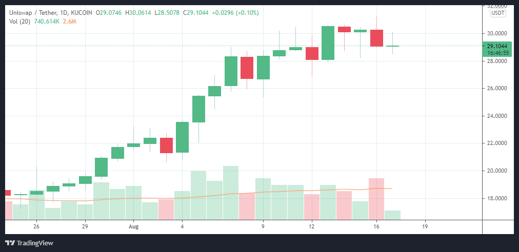 The Uniswap Price is continuing its bullish path from its July 20 low with an appreciation of almost 100% from the price level of $16 reached back then. UNI suffered a slight pullback on the 16 August when the price descended by about 3% from just over $30 to the $29.10 level. This did not make much of an effect on the overall picture and the DeFi exchange token is well on its way to retain the $30 level.