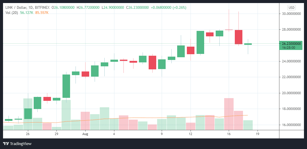 Although the Chainlink price has retreated from its bi-monthly high of$28 to the $26.50 level, the short-term prospects remain bullish. LINK is up by more than 100% from its July 20 low of 13.59 making it one of the best performing cryptos over the past month. This ascending trend is expected to continue.