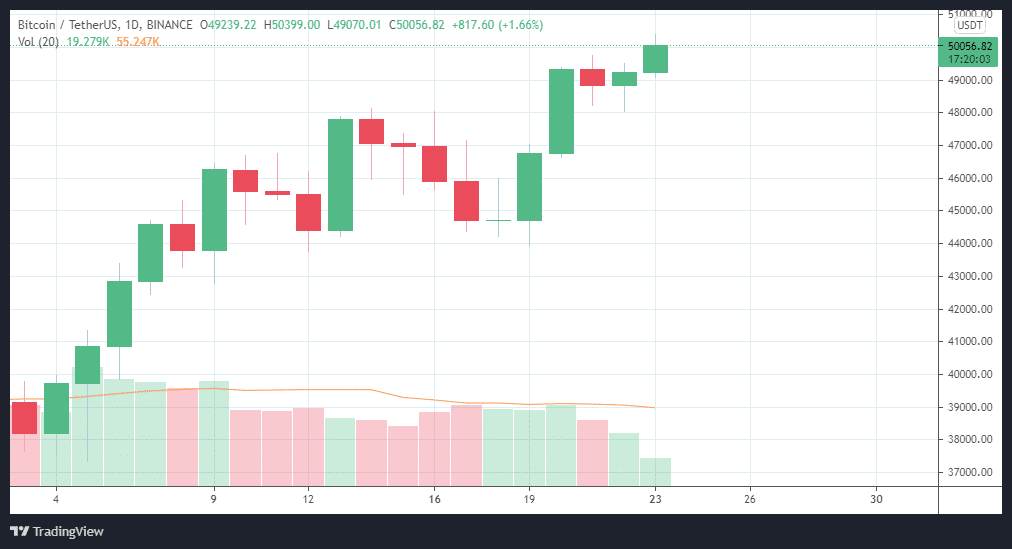 The Bitcoin price has sailed past the psychologically significant and important $50K resistance mark. It had been trading sideways for a number of days with some minor pullbacks but it now appears that a decisive move forward has finally been made.