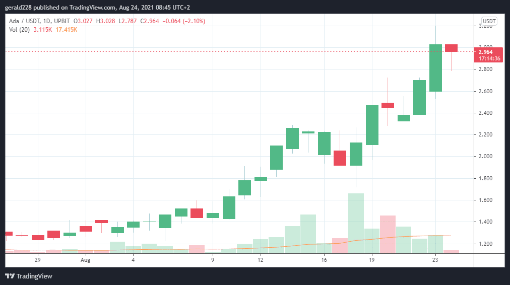 Although there will be inevitable pullbacks, the Cardano price still seems rather bullish even on a short-term basis. Institutional investors appear to be piling in and bullish sentiment is through the roof. August has been an incredible month for Cardano where the price has risen an astonishing 120% from $1.20 to $3.00 before falling back slightly to $2.96 over the past 24 hours.