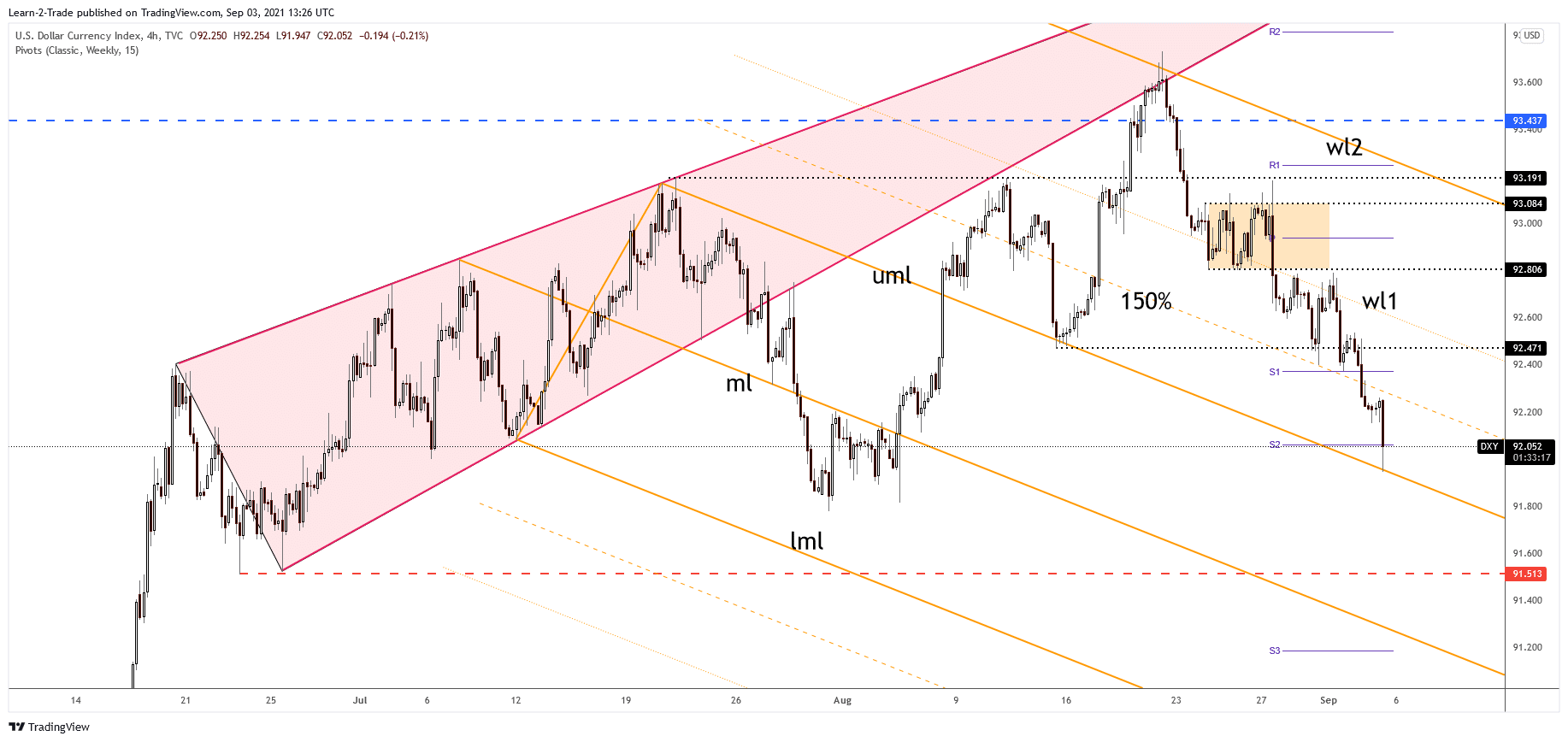 The DXY price has found support below the weekly S2 (92.06) right on the descending pitchfork’s upper median line (UML). However, the rebound could be only a temporary one. The pressure is high, so the index could drop anytime. USD could lose more ground versus the other major currencies if the index slips lower.