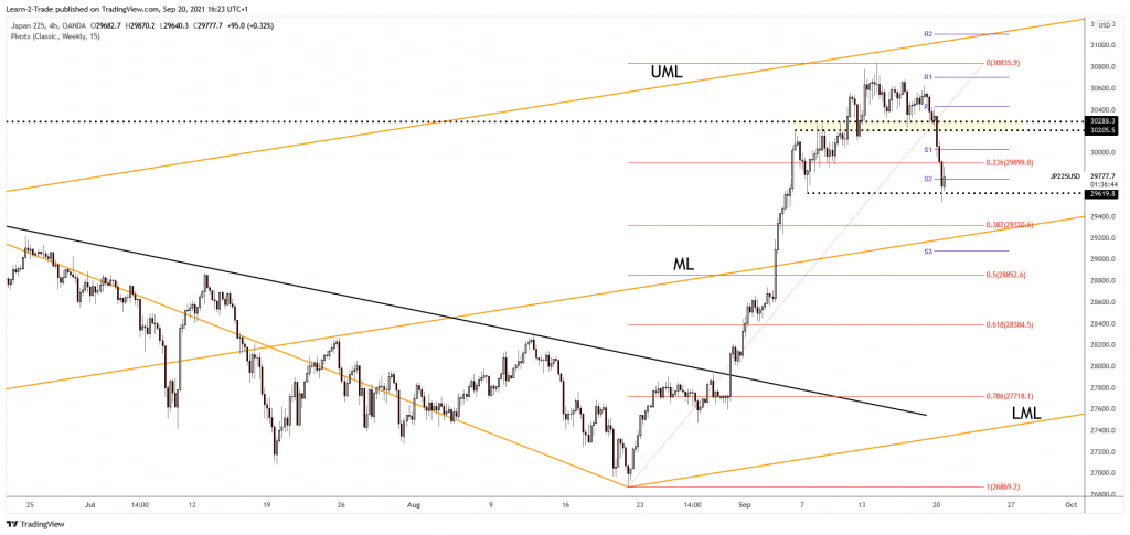 JP225 failed to reach the ascending pitchfork’s upper median line (UML), signaling high selling pressure and exhausted buyers. The index has registered only a false breakdown through the 29,619 former low. Still, the pressure is high. It could drop further anytime. Technically, it could be attracted by the median line (ML) after failing to hit the UML.