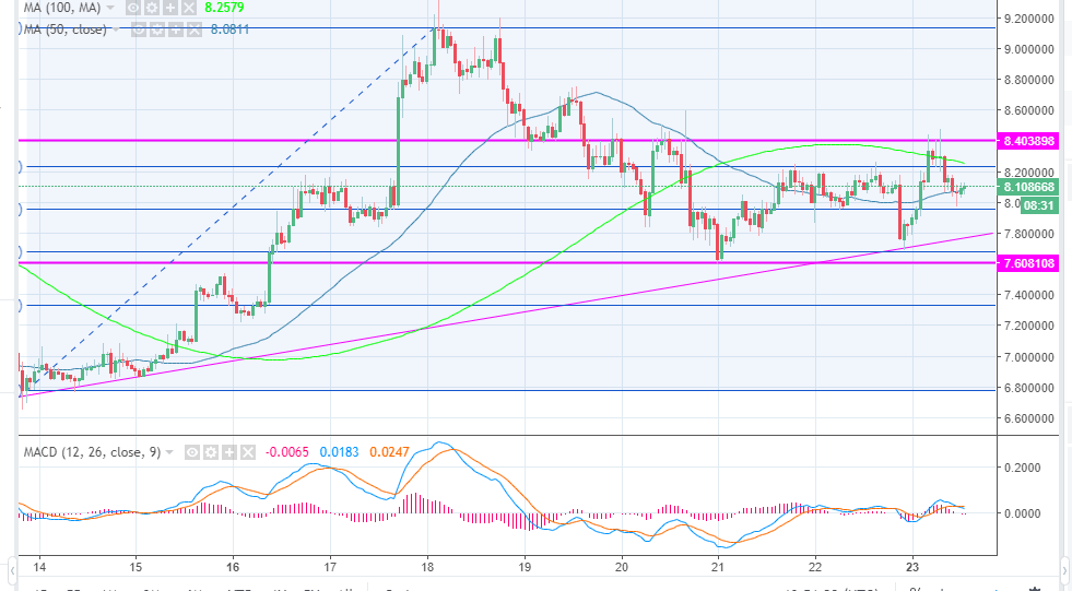 EOS/USD is range-bound with the upper limit at $8.40 while the lower limit is at $7.60. The trend indicators are sending mixed messages, for example, the MACD is advancing towards the negative regions to show that sellers are seeking entry while the gap between the 50 SMA and the 100 SMA is decreasing signalling that buying pressure is still present.