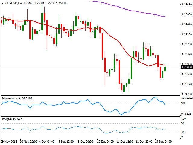 The GBP/USD pair bottomed at 1.2479 last week, its lowest since April 2017, bouncing up to 1.2686 after PM May survived to the no-confidence vote, resuming its decline afterwards. The mentioned high was way below the weekly one at 1.2759, indicating that market players still see recoveries as an opportunity to sell. According to the daily chart, the bearish trend is set to continue, as the pair is developing well below its 20 DMA, which extends its slump below the 200 EMA, while technical indicators resumed their declines within negative levels after a modest bounce from nearly oversold readings. In the 4 hours chart, the price settled below a directionless 20 SMA, while technical indicators hold within the bearish ground, the Momentum heading lower and the RSI hovering around 45, all of which maintains the risk skewed to the downside.