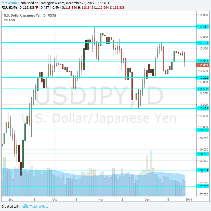 Dollar/yen traded slightly lower in the final week of 2017, sliding together with the general weakness of the US dollar. However, it never fell out of range. Will we see fireworks in 2018? The year begins with the US Non-Farm Payrolls, and that is a promising start.