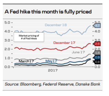 …We raise our forecast and now think the Fed is set to hike three times this year in March, July and December (previously we expected two hikes with risk skewed towards a third hike), as the Fed seems less worried about inflation and has increased its weight on labour market and growth data. We stick to our view that the Fed is only set to hike once in H1 17 but now twice in H2 17 when we get more information about Trumponomics. By hiking at one of the small meetings in July, the Fed shows that it means that every meeting is ‘live’. Markets price in 2.5 hikes this year.